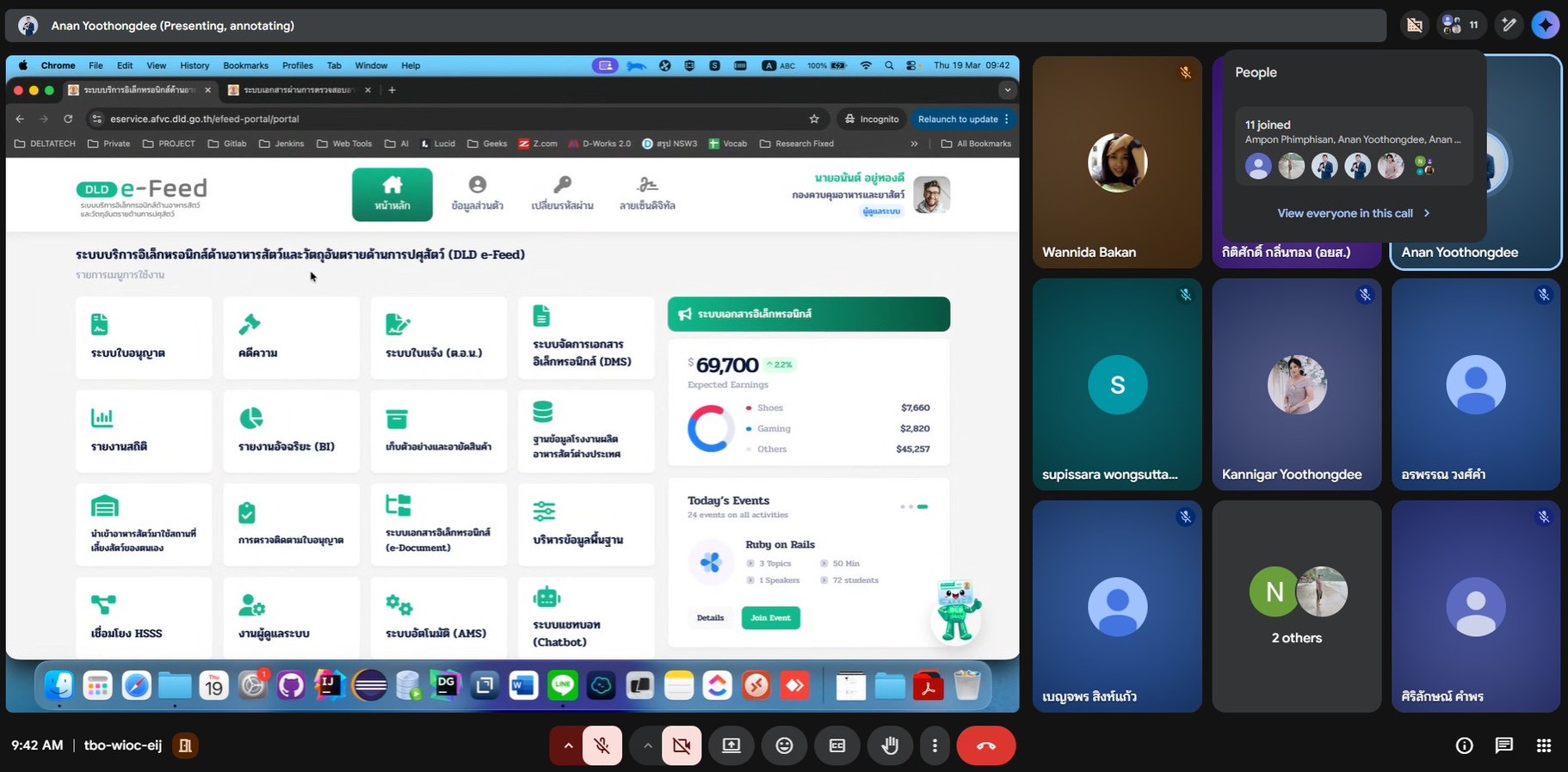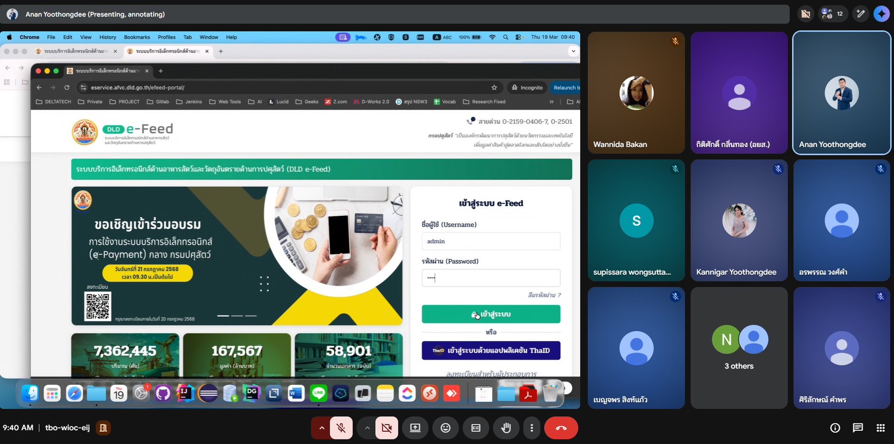 วันที่ 19 มีนาคม 25569 เวลา 9.00 - 12.00 น. นายกิติศักดิ์ กลิ่นทอง หัวหน้าศูนย์สารสนเทศ ด้านอาหารสัตว์และวัตถุอันตรายประชุมติดตามความคืบหน้าการปรับปรุง ระบบบริการอิเล็กทรอนิกส์ด้านอาหารสัตว์และวัตถุอัตรายด้านการปศุสัตว์ (ระบบควบคุมการนำเข้าส่งออกและงานด่านอาหารสัตว์)กับบริษัทผู้พัฒนาระบบ โดยมีเจ้าหน้าที่ กลุ่มควบคุมการนำเข้าส่งออกและงานด่านอาหารสัตว์ เข้าร่วมติดตามความก้าวหน้า ณ ห้องประชุม 2 ตู้คอนเทนเนอร์ กองควบคุมอาหารและยาสัตว์ ศูนย์ราชการกรมปศุสัตว์จังหวัดปทุมธานี และประชุมผ่านสื่ออิเล็กทรอนิกส์ (Google Meet) ซึ่งโครงการนี้ดำเนินการภายใต้โครงการ เพิ่มประสิทธิภาพระบบบริการอิเล็กทรอนิกส์ด้านอาหารสัตว์และวัตถุอันตรายด้านการปศุสัตว์ และการเชื่อมโยงข้อมูลระบบ National Single Window (NSW) ในรูปแบบ Single Submission
