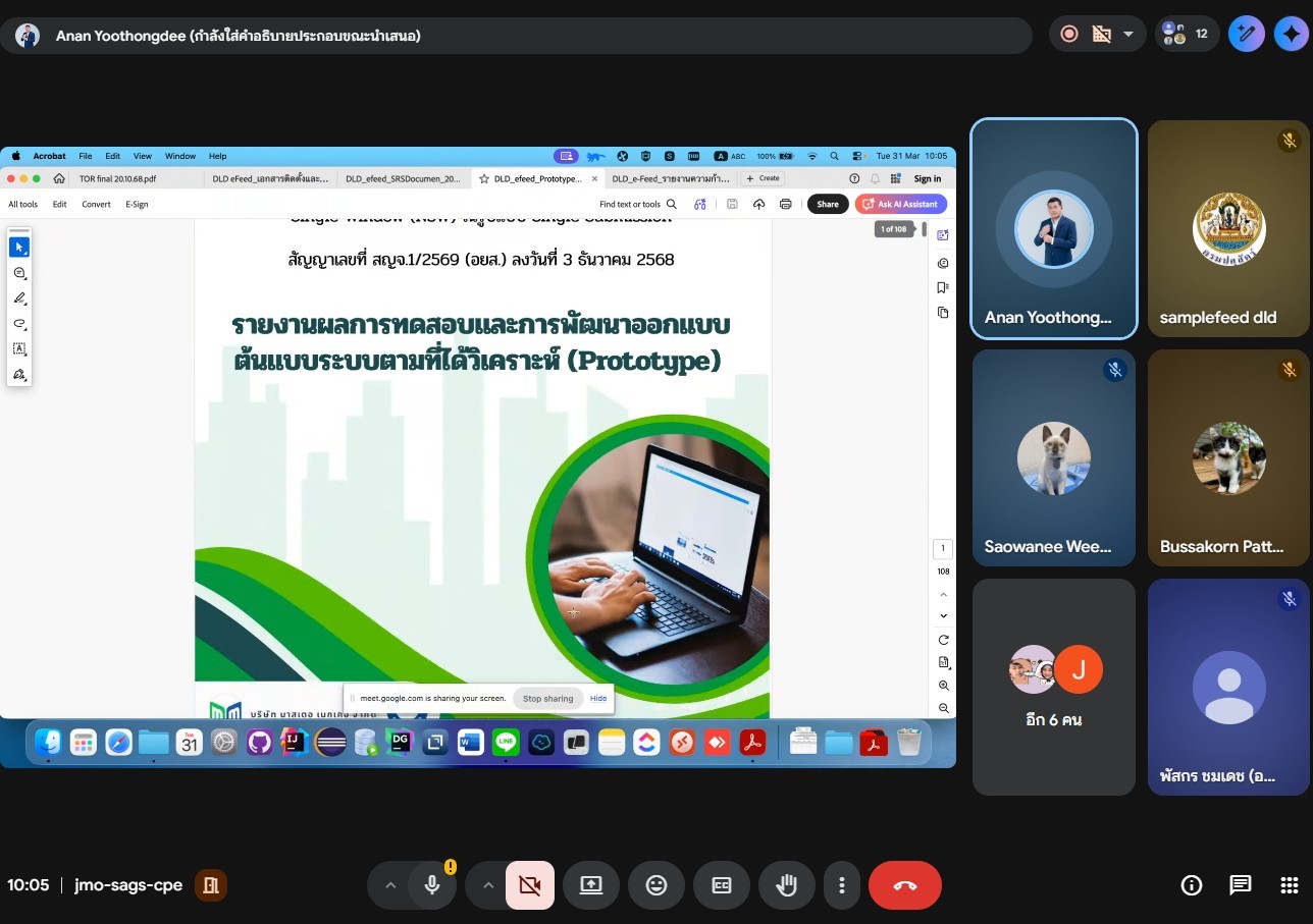 วันที่ 31 มีนาคม 2569 เวลา 10.00 - 12.00 น. คณะกรรมการตรวจรับ ประชุมตรวจรับงาน งวดที่ 2 โครงการเพิ่มประสิทธิภาพระบบบริการอิเล็กทรอนิกส์ด้านอาหารสัตว์และวัตถุอันตรายด้านการปศุสัตว์ และการเชื่อมโยงข้อมูลระบบ National Single Window (NSW) ในรูปแบบ Single Submission กับบริษัทผู้พัฒนาระบบ (บริษัท มาสเตอ เมอเคอ จำกัด) ผ่านสื่ออิเล็กทรอนิกส์ (Google Meet) ณ ห้องประชุม 2 ตู้คอนเทรนเนอร์ กองควบคุมอาหารและยาสัตว์ ศูนย์ราชการกรมปศุสัตว์จังหวัดปทุมธานี